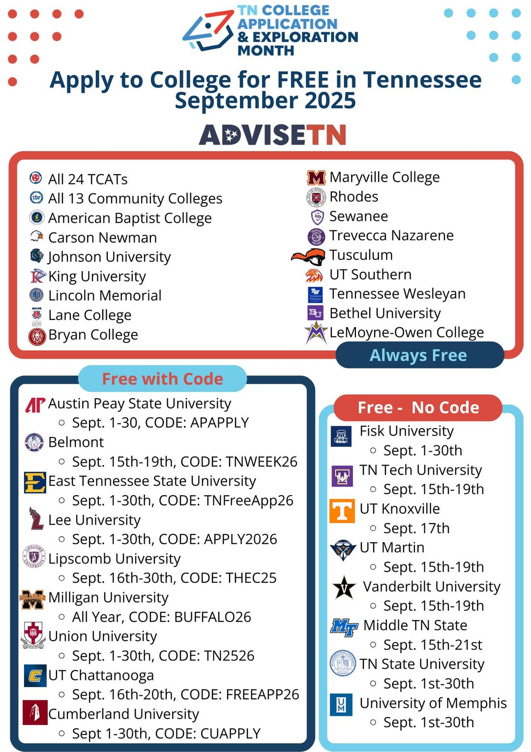✅ Many Tennessee universities are offering free applications with codes or during special dates